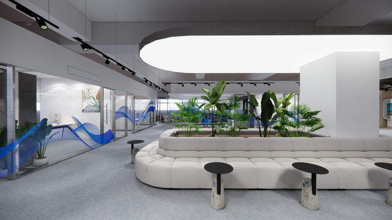 This modern industrial-style office space features a specially designed lounge area that incorporates thoughtfully crafted installation art, creating three-dimensional thematic elements that enhance spatial dynamism and creativity throughout the environment. The ceiling is equipped with track lighting that provides even and comfortable illumination. The three-dimensional feature elements in the lounge area are designed to be flexible, allowing themes and displayed objects to be easily changed, injecting ongoing vitality and freshness into the workplace. This approach fosters an inspiring and enjoyable work environment, where occupants can experience both creative stimulation and a sense of pleasure in their daily work.