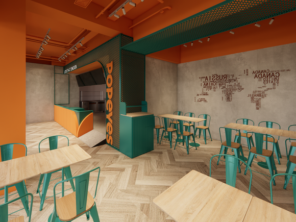 以鮮明的橙色與綠色為主調,創造出充滿活力與熱情的視覺氛圍。整體風格現代化且充滿品牌識別,橙色的大量運用讓人聯想到熱情、溫暖和活力,契合炸雞品牌的形象。綠色的框架和網格設計則增添了設計感,同時提升視覺層次,使空間更具動態效果。天花板上的簡約軌道燈提供適量的照明,增強空間的現代感。內部廚房設備一目了然,展示出專業的餐飲作業環境。此外,「LOVE THAT CHICKEN」的標語醒目地位於櫃台上方,加強了品牌的核心訊息,讓顧客感受到品牌的熱情。整體設計成功地結合了功能性與品牌風格,為顧客帶來獨特且難忘的體驗。