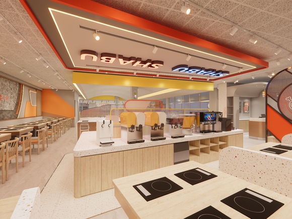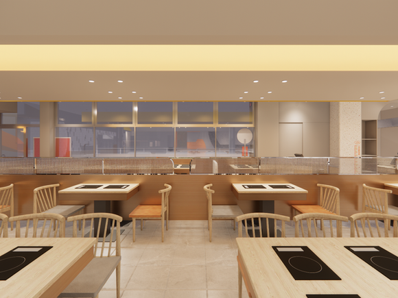 This space showcases a Contemporary Pop-Industrial design language, breathing new life into Taiwan’s traditional hot pot culture. The design centers on Qian Du’s signature vibrant orange and bright yellow, boldly combined in large color blocks and skillfully paired with light wood tones and textured terrazzo elements, creating a retro yet fashionable “New Taiwanese Flavor.” The high, industrial-style gray ceiling with track lighting outlines the space’s edgy contours, while the prominent central “SHABU SHABU” neon sign serves as a visual focal point, giving the space a modern, trendy vibe. Overall, the design balances the rawness of the industrial style with the warmth of wood through bright natural lighting and clean geometric lines, offering customers a stylish yet comfortable social dining experience.