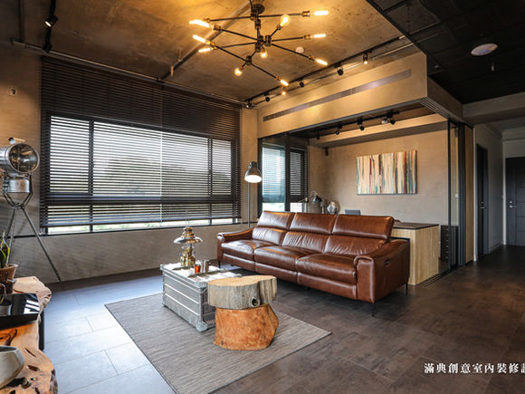 以工業風為主題,運用大量自然材質和簡約的設計元素。原始的水泥天花板搭配復古吊燈,營造出質樸粗獷的氛圍;牆面使用金屬銹色質感,增添視覺上的層次感。大型皮革沙發帶來舒適感,而中間的原木茶几則讓空間更具自然氣息。寬敞的落地窗提供充足的自然光,使整體空間既有工業風格的冷冽,也不失溫暖的舒適感。