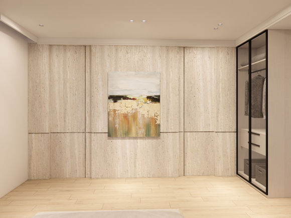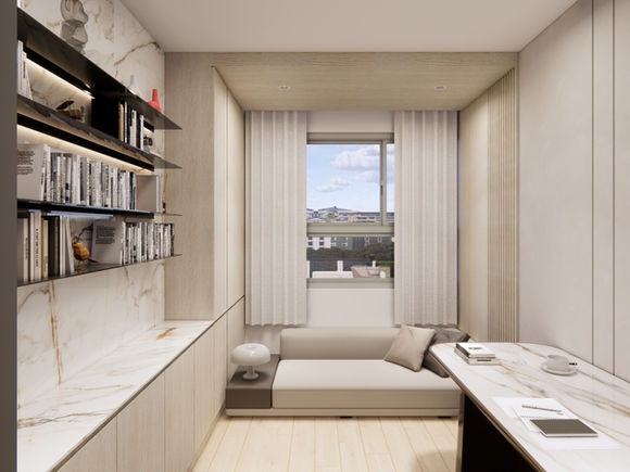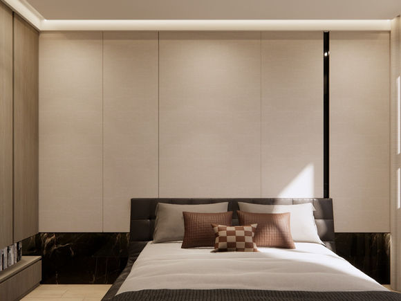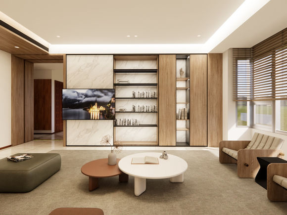 現代簡約風格的設計,充滿溫馨且高雅的氣氛。空間結合了天然木質元素與大理石材質,營造出平衡與和諧的感覺。牆面採用大理石紋理,搭配木質裝飾,給人一種穩重且奢華的視覺效果。牆面中央的開放式展示櫃,增強了空間的實用性,透過擺放的藝術雕塑和書籍,增加了文化氣息與個性化的風格。空間內的家具線條簡潔,低調而不失品味。木質的扶手椅搭配柔軟的皮質坐墊,為空間帶來溫暖與舒適感。圓形的茶几設計柔和了整體空間的硬線條,營造出輕鬆的休閒氛圍。大面窗戶讓自然光線充足地灑入室內,木質百葉窗更可以靈活調節光線,為空間提供了舒適的採光條件。
